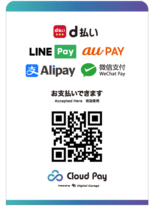 * Cloud Pay(クラウドペイ)は、BtoBtoC型で展開する国内唯一の統一型QRコード決済ソリューションです。Cloud Pay(クラウドペイ)は、株式会社デジタルガレージの登録商標です。