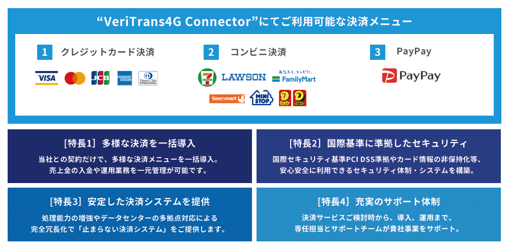 「VeriTrans4G」は、クレジットカード、コンビニ、銀行などの基本決済はもとより、電子マネー、キャリア決済、PayPayをはじめとする各種ID決済のほか、銀聯、Alipay、PayPal等の国際決済まで業界最多レベルの決済手段に対応した総合決済ソリューションです。カード情報の非保持化に完全対応した国内最高水準のセキュアなシステムを基盤に、継続課金やカード情報更新機能などの基本機能や不正利用を防止する多様なセキュリティオプションを標準提供しています。