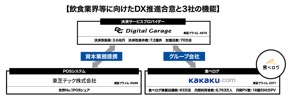 株式会社デジタルガレージ(東証プライム 4819、本社:東京都渋谷区、代表取締役 兼 社長執行役員グループCEO:林 郁、以下:DG)、DGのグループ会社の株式会社カカクコム(東証プライム 2371、本社:東京都渋谷区、代表取締役社長:畑 彰之介、以下:カカクコム)および東芝テック株式会社(東証プライム 6588、本社:東京都品川区、代表取締役社長:錦織 弘信、以下:東芝テック)の3社は、カカクコムの運営する「食べログオーダー」を戦略的に支援する基本合意書を締結しました。