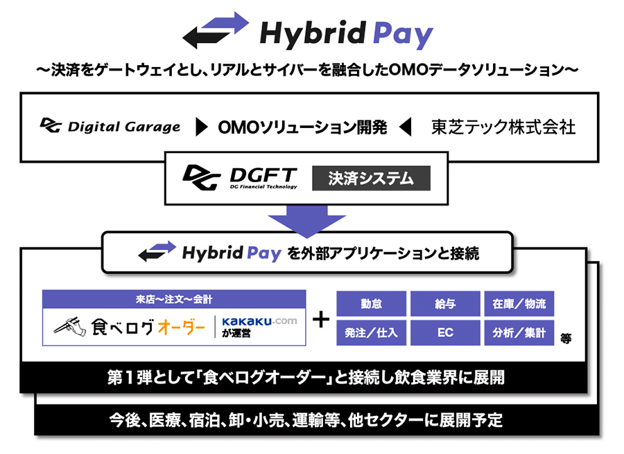 昨年12月に締結したDGと東芝テックの資本業務提携契約に基づき、総合決済サービス「VeriTrans4G」と東芝テックのPOSシステムを有機的に接続し、「Hybrid Pay」(飲食業界向けOMO)をスタートします。今後、さまざまな周辺サービスを拡充し、日本を代表するOMO(リアルとサイバーのハイブリッド型)のユニバーサルサービスへと進化させていきます。