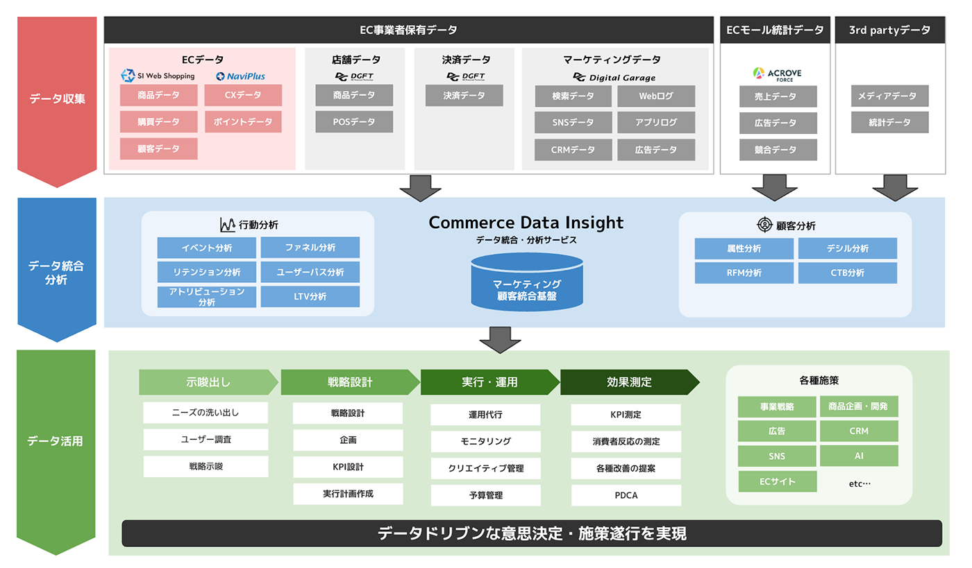 「Commerce Data Insight」は、EC事業者やACROVEが保有する各種データや3rd Partyデータ等のデータリソースを収集・統合し、多岐にわたる分析機能をもとにデータドリブンな意思決定や施策遂行を実現するデータマネジメントプラットフォームです。「Commerce Data Insight」がデータ活用に関わるすべてのプロセスをカバーし、示唆出し、戦略設計、実行運用、効果測定まで、一連のプロセスをサポートするため、事業戦略の立案や改善、広告運用の最適化、SNSプラットフォームでのターゲティング、ECサイトの改善、新商品の企画・開発、CRM戦略の強化、AIを活用したパーソナライゼーションなど、多岐にわたる施策のスピーディーな実行を強力に支援します。