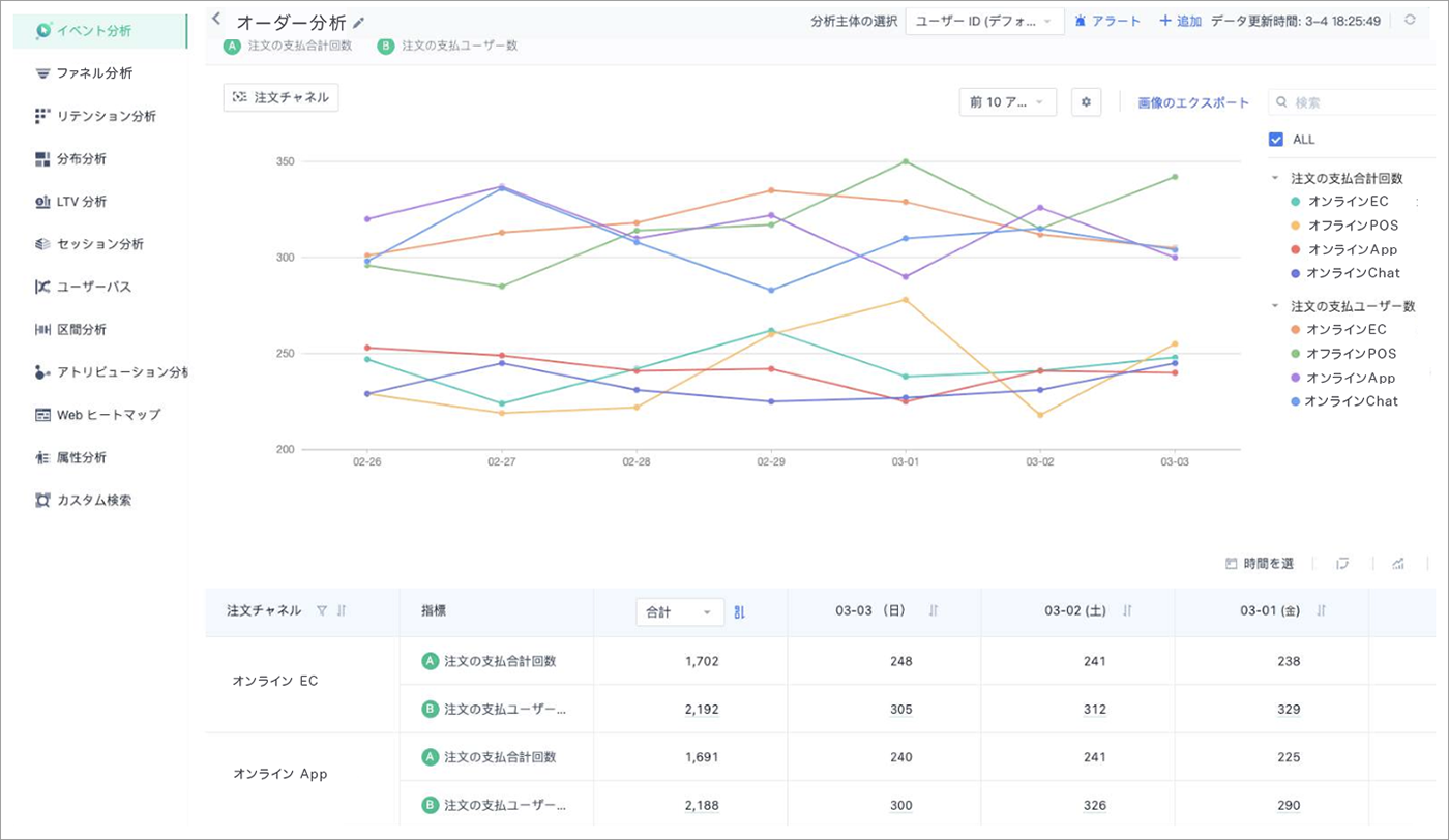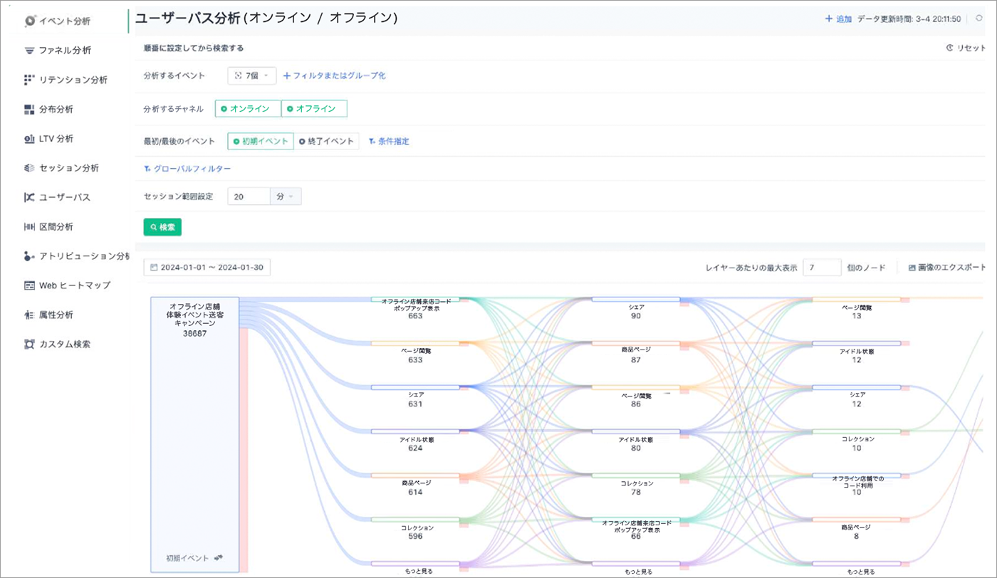イベント分析、リテンション分析、アトリビューション分析、ファネル分析、ユーザーパス分析、LTV分析など、オンラインだけでなくオフラインのデータも活用しつつ、さまざまな側面からの行動解析が可能。 - 顧客分析