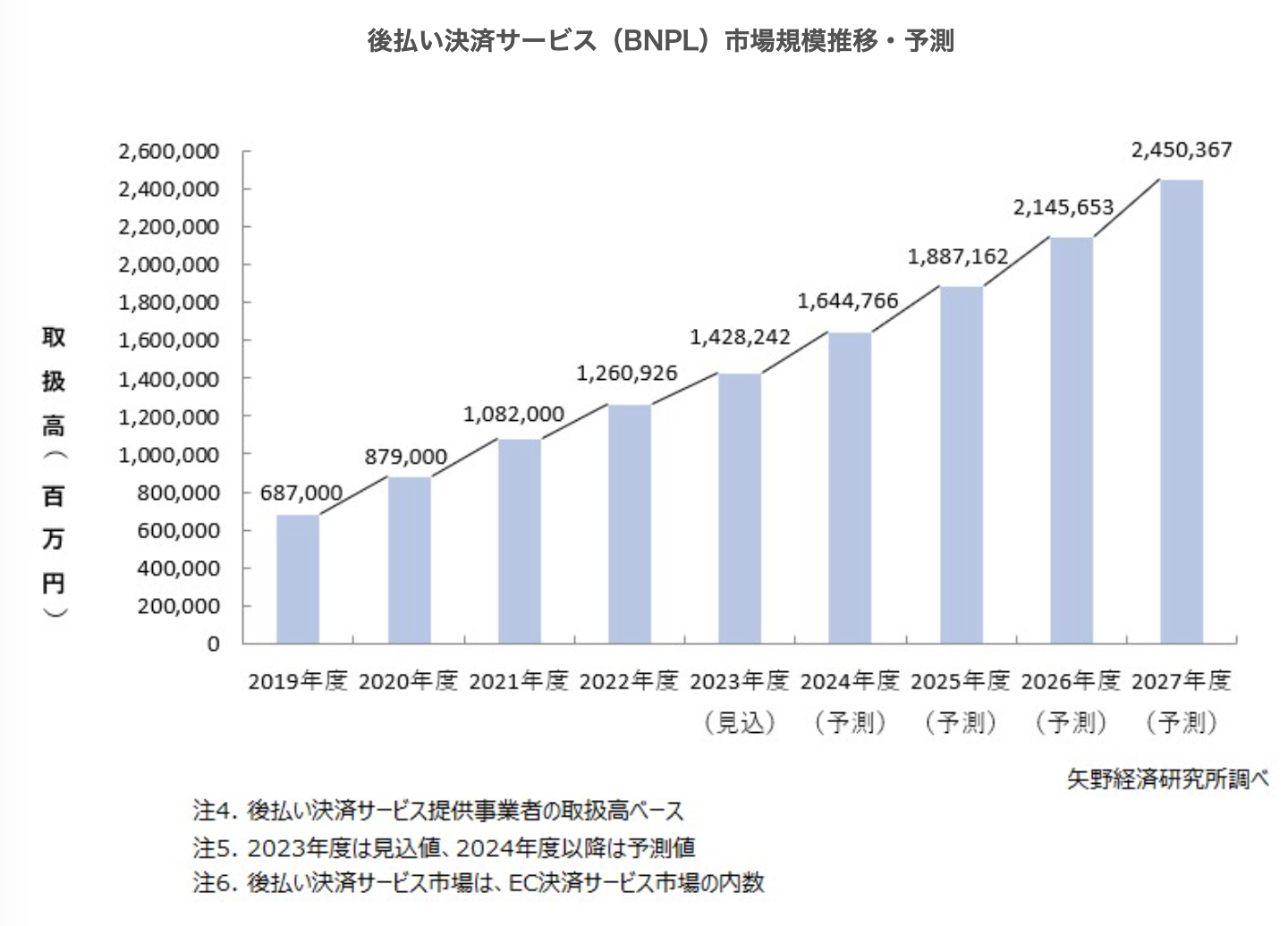 利用環境の拡大や、決済単価の向上等を背景に、後払い決済サービス市場は、2026年度に2兆円の水準まで拡大すると予測する。