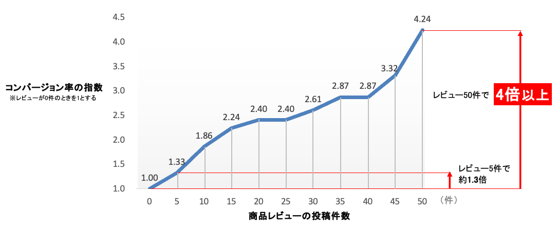 ECサイトにおいては、一定数の商品レビューがお客様の購買意欲を高める傾向があると言われており、ナビプラスの調査からも商品レビュー数増加がコンバージョン率に良い影響を及ぼすことが分かっております(※1)。
