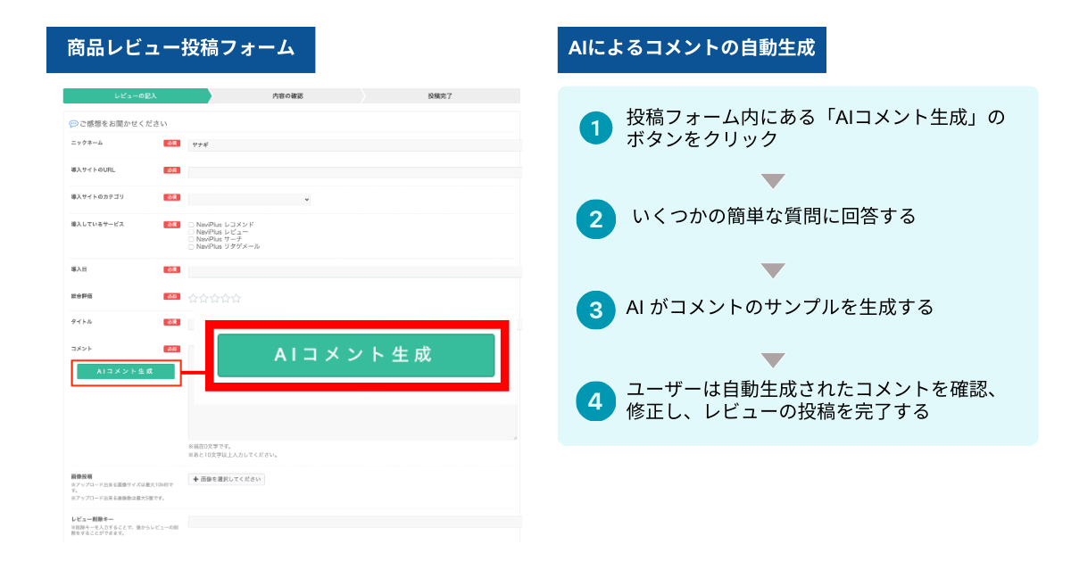 この課題を解決するため、ナビプラスはAIを活用して商品レビューの文案を提案し、投稿をサポートする機能を新たに開発いたしました。