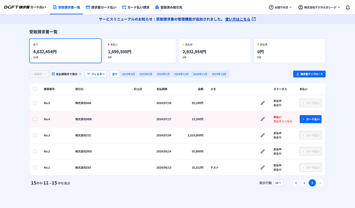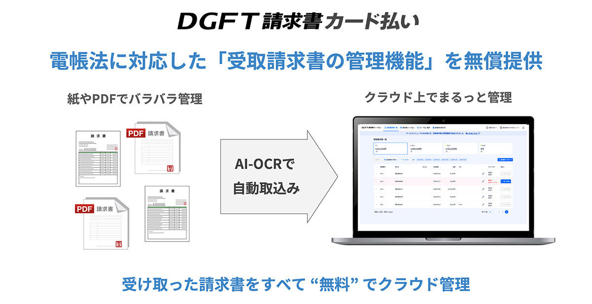株式会社デジタルガレージ(東証プライム 4819、本社:東京都渋谷区、代表取締役 兼 社長執行役員グループCEO:林 郁、以下:デジタルガレージ)は、B2B決済サービス「DGFT請求書カード払い」 において新たにユーザーが無料で使える受取請求書の管理機能を追加しました。本機能によって、ユーザーはメールや郵送で受け取ったすべての請求書をクラウド上で一元管理することができ、請求書保管業務の効率化と同時に電子帳簿保存法に対応することが可能になりました。