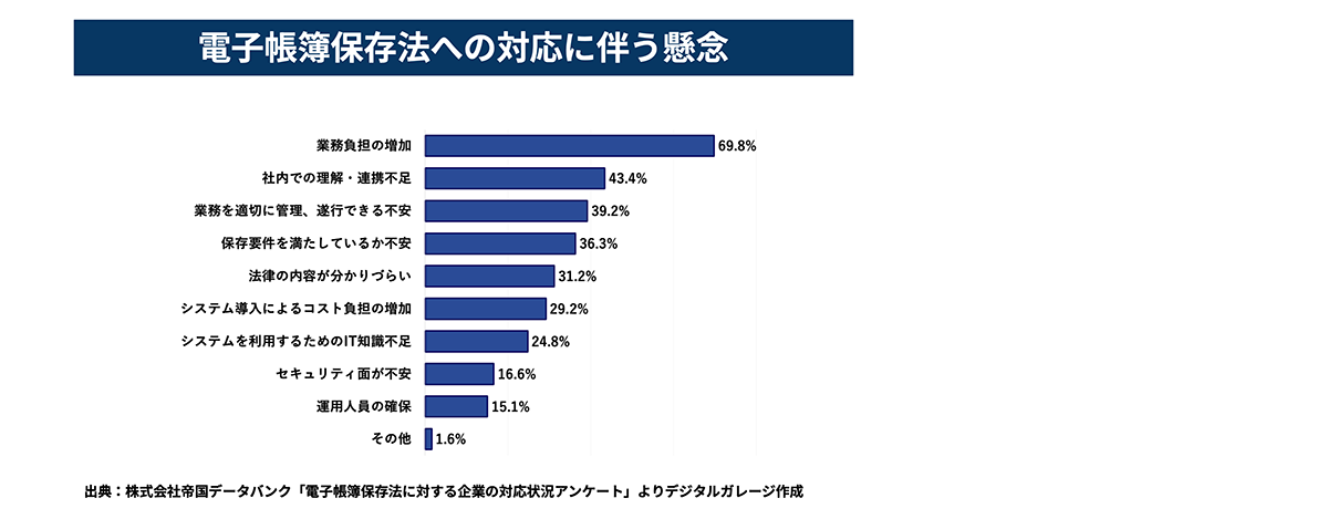 日本企業の9割以上を占める中小企業(※1)においては、業界特有の商習慣による資金繰りや人手不足に課題を抱えるケースが少なくありません。その状況下で、2024年に完全義務化された改正電子帳簿保存法(電帳法)への対応に関しては、中小企業における未完了率は高く、電帳法への対応に伴う懸念事項として約7割の会社が“業務負担の増加”を挙げています(※2)。