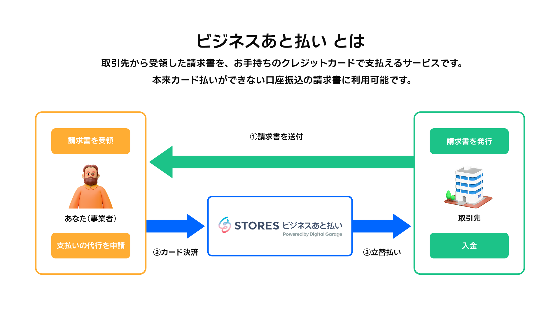 「STORES」を利用する小売、飲食、サービス業を中心とする中小事業者が日常的に受け取っている請求書を、資金繰りの必要性に応じて銀行振込からカード払いに切り替える利用を想定しています。