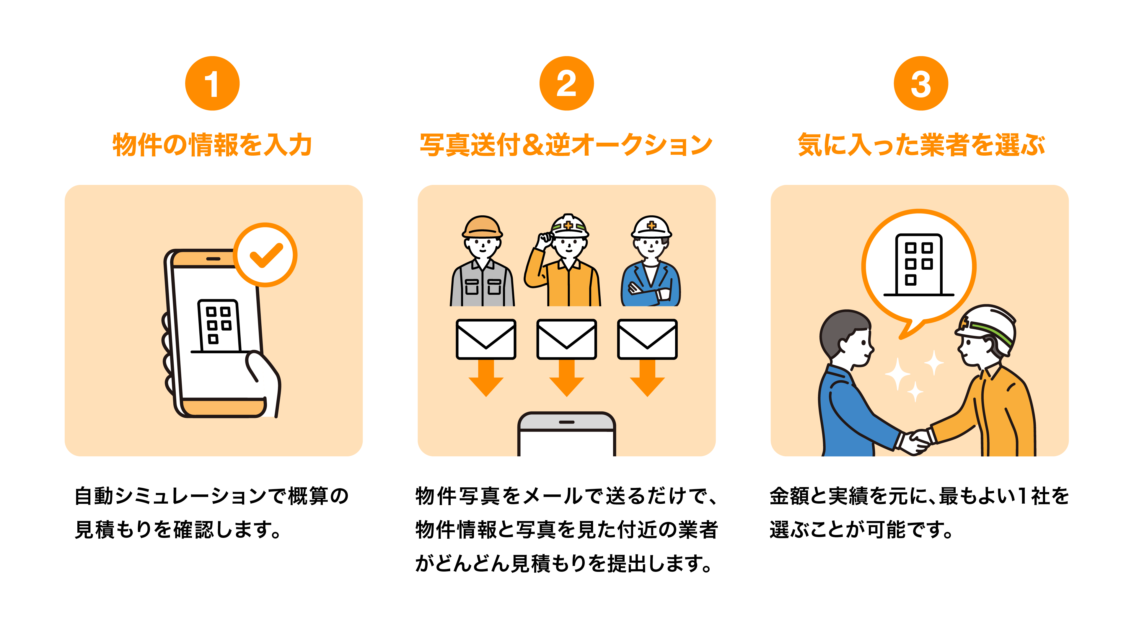 解体工事の専門家であるコンシェルジュが、客観的な目線でユーザー様の解体工事会社選びをサポート。解体にまつわるあらゆるご相談を、全て一貫してご相談いただけます。 解体工事の見積もりに必要な情報を、コンシェルジュが整理したうえで最適な解体工事会社とマッチングするので、最小限の手間でご利用いただくことが可能です。